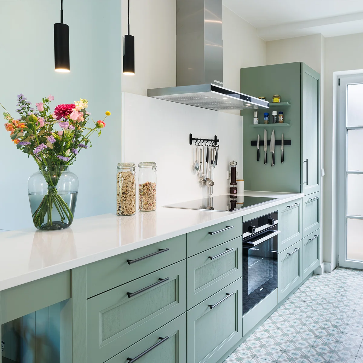- Küche in Salbeigrün: Modern und schlicht beschreibt diese Farbe am besten. Fronten für die Küche in Salbeigrün sind ein echter Hingucker und verwandeln die Küche in eine Wohlfühloase. Um die natürliche Wirkung der Farbe zu unterstützen, eignen sich besonders gut helle Farben wie Weiß, Creme und Beige. Hierdurch entstehen ein elegantes Design und eine ruhige Atmosphäre.